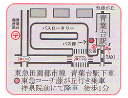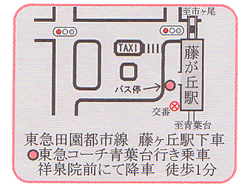 - 東急田園都市線、青葉台駅下車 →東急コーチ藤が丘行き乗車、祥泉院前にて降車 徒歩1分